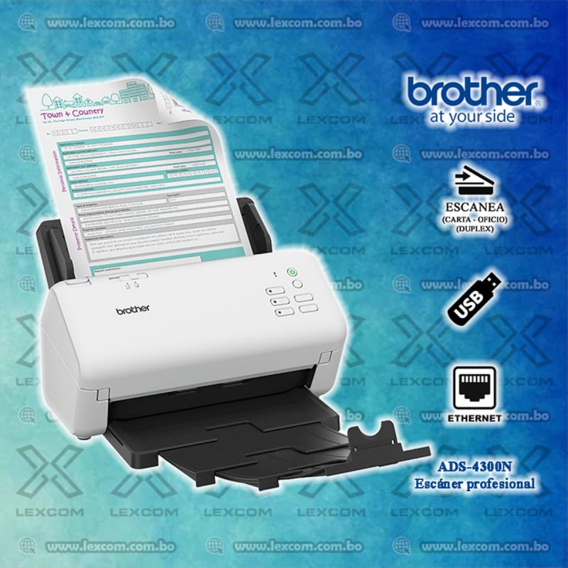 ESCANER PROFESIONAL BROTHER ADS-4300N Especificaciones técnicas:- Tipo de Escáner: CIS dual - Conectividad: USB 3.0, Ethernet - Salida a USB pendrive: Sí - Tamaño de papel: A4 / Carta / Oficio - Veloc...